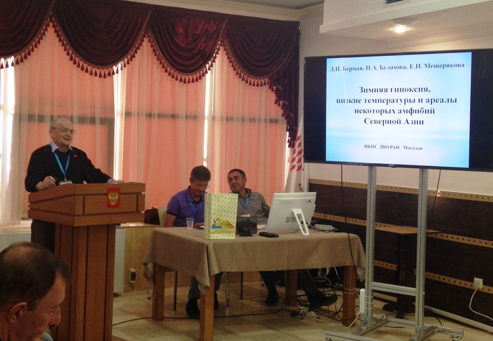 Постоянные участники съездов Герпетологического общества им. А. М. Никольского — сотрудники лаборатории биоценологии нашего института. На протяжении многих лет один из неизменных объектов исследований, проводимых под руководством профессора Д. И. Бермана, − сибирский углозуб, самое северное земноводное. Экологии, физиологии, морфологии и филогеографии этого вида на северо-востоке посвящена серия публикаций магаданских зоологов в отечественных и зарубежных журналах. В последние годы интерес к биологии наземных пойкилотермных животных «перерос» в отдельное научное направление лаборатории — изучение адаптаций земноводных и пресмыкающихся севера Евразии к экстремальных условиям среды. Список объектов сегодняшних исследований включает в себя не только субарктические виды герпетофауны, основными лимитирующими распространение факторами которых служат экстремально низкие зимние температуры и краткое прохладное лето, но и ряд южных видов, ареалы которых ограничены иными критическими условиями.