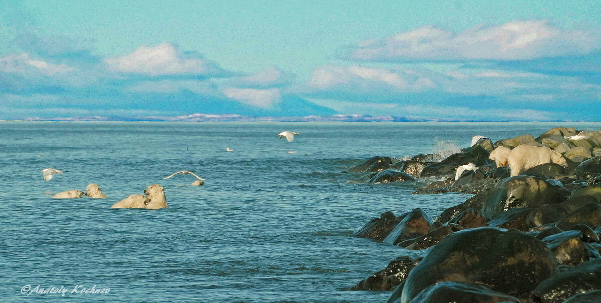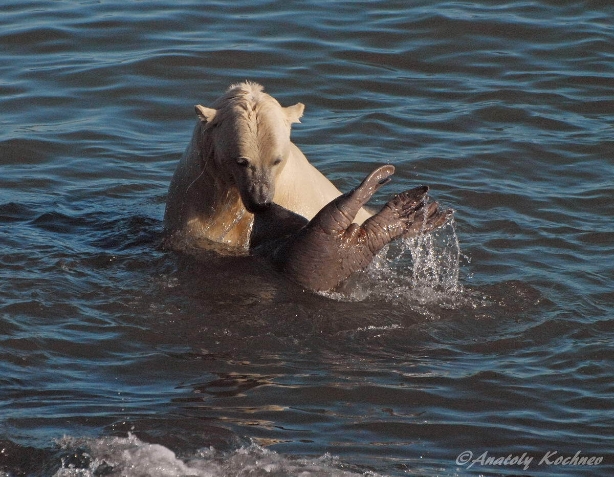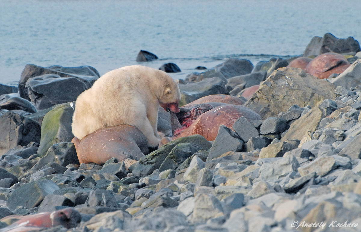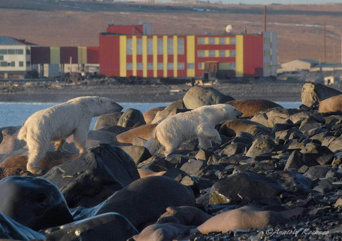Внутривидовая толерантность белых медведей стремительно переросла в межвидовую, т. е. хищники удивительно быстро перестали воспринимать человека как опасное существо и даже предпринимали попытки распространить свою модель поведения на наблюдателей-исследователей. Они часто приближались вплотную, явно пытаясь познакомиться поближе, а после того как их отгоняли агрессивными выпадами или выстрелами из ракетниц, уходили в полном недоумении. И если для человека, давно занимающегося изучением белых медведей, такое поведение знакомо и понятно, то для большинства жителей села Рыркайпий, расположенного менее чем в километре от Утеса Кожевникова, оно представляло массу проблем и неприятностей. Молодые медведи почти каждую ночь наведывались в село, которое для любопытных зверей было таким же интересным экскурсионным объектом, как и моржовое лежбище. Жители села создали специальный «медвежий патруль», который прогонял хищников за черту населенного пункта. В этом сезоне конфликтов не произошло, за исключением разбитого окна в одном из домов, где временно поселившиеся военные развлекались прикармливанием медведя. Однако соседство большого количества белых медведей с населенным пунктом − это мина замедленного действия, которая когда-нибудь обязательно взорвется. И в результате пострадают и люди, и звери.