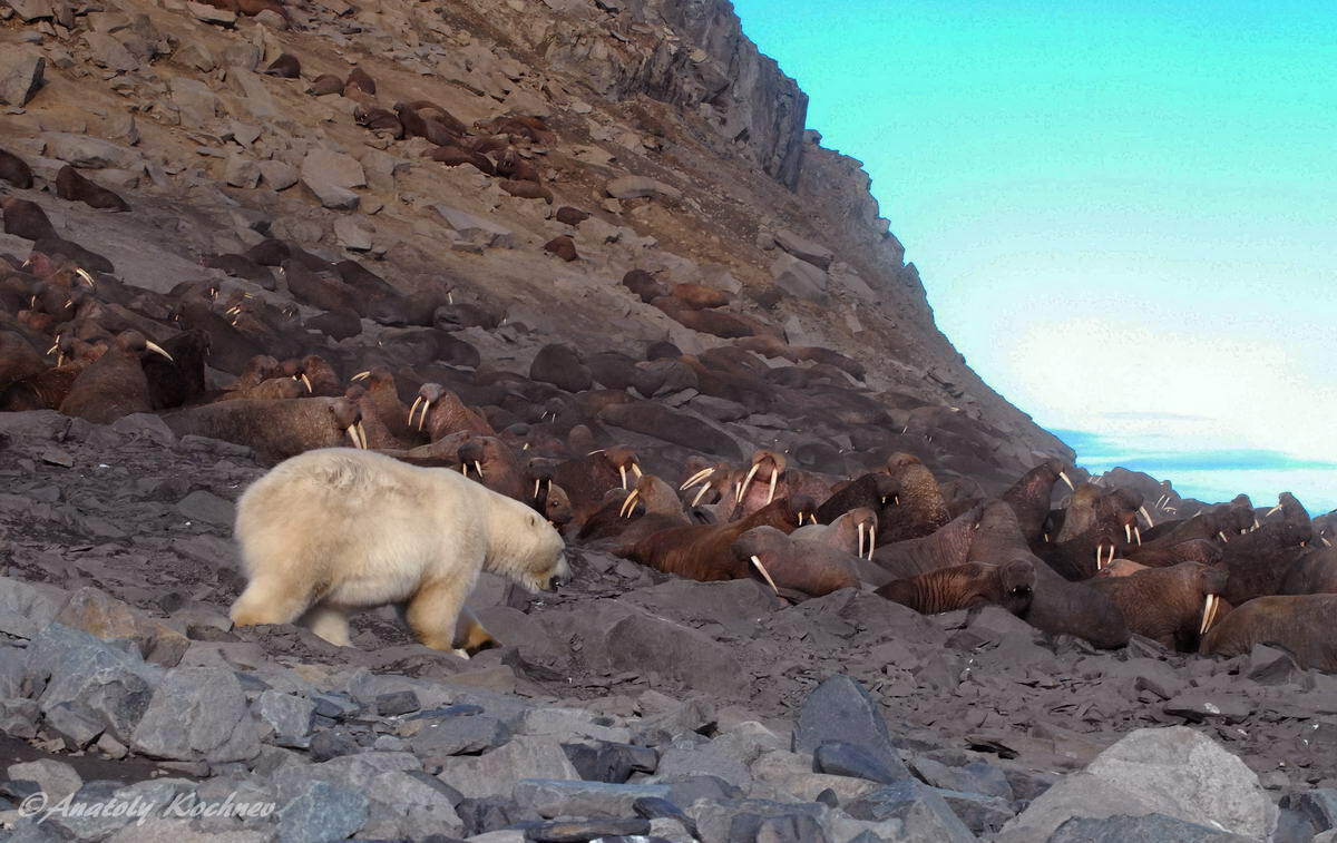 В 2017 г. большую часть времени белые медведи отдыхали на тундровом предгорье и в курумах на крутых склонах утеса. Здесь наблюдалась отчетливая пространственная дифференциация зверей — матерые самцы предпочитали держаться неподалеку друг от друга, но в отдалении от молодняка и самок с медвежатами. Когда подошли моржи, медведи несколько раз активно охотились и добыли двух или трех молодых моржей, обеспечив себя пищей на одну-две недели. За это время численность моржей увеличилась до нескольких тысяч. Несмотря на то что медведи были сытыми, они продолжали посещать лежбище, скорее, ради развлечения, нежели охоты. Хотя, учитывая последствия, такое развлечение можно расценить и как «пассивную» охоту − на приближение медведей моржи всегда реагировали паническим «бегством» в воду, во время которого множество молодых и физически слабых сородичей получали травмы и погибали в давке. Большое количество моржей погибло и при падении с крутых обрывов, куда они забирались из-за нехватки места на пляже. Белым медведям их гибель обеспечила сытую жизнь на берегу; вплоть до того времени, когда море стало замерзать, да и на большую часть зимы.