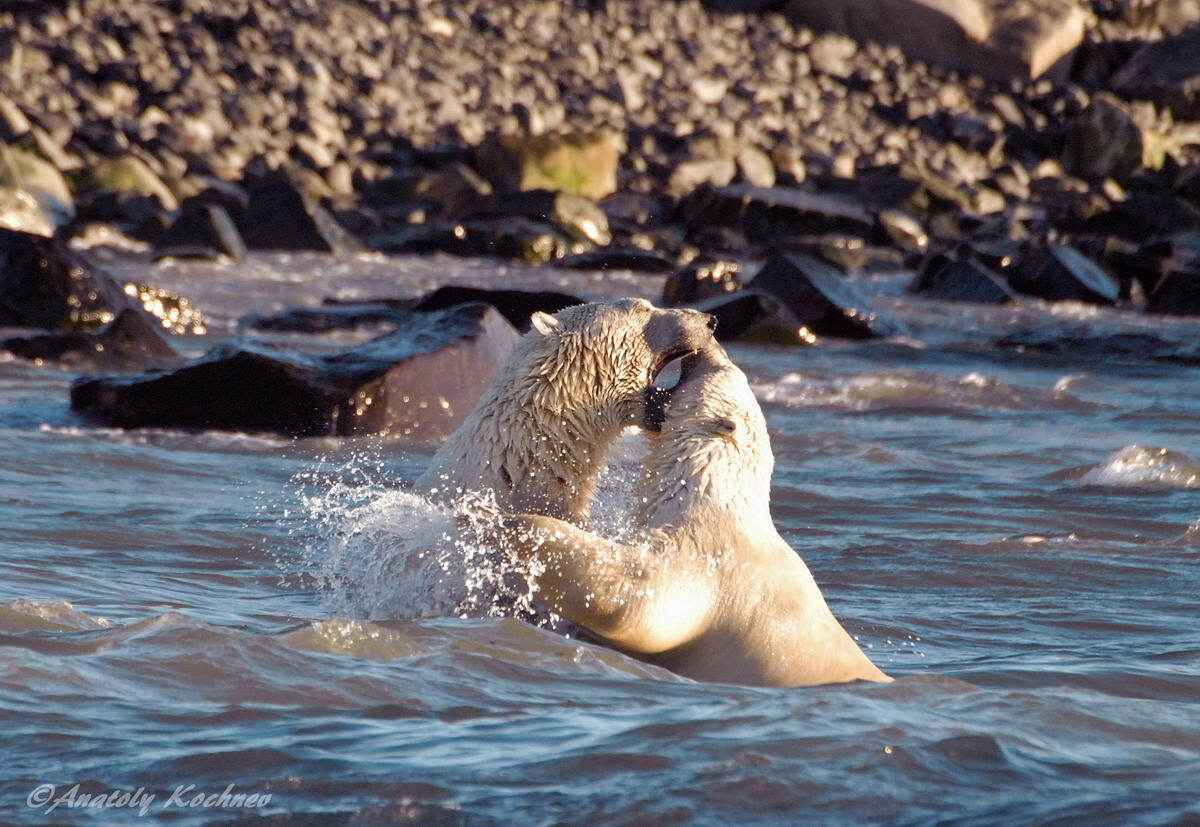 На Утесе Кожевникова очень интересно было наблюдать, как при изобилии пищи и высокой плотности хищники, считающиеся хрестоматийным примером вида-одиночки со слабо выраженными социальными связями, меняют модель поведения. В этих условиях почти отсутствуют агонистические взаимодействия, которые обычно наблюдаются только в тех случаях, когда самки с медвежатами оказываются близко от взрослых самцов. В таких конфликтах медведицы иногда активно отгоняли самцов, хотя те не выказывали агрессию по отношению к ним или медвежатам. Однажды самка трижды делала выпады на самца, который был раза в полтора крупнее ее самой, а когда тот пустился бежать, укусила его за круп. Но такие агрессивные контакты были редкостью. Белые медведи проявляли удивительную толерантность друг к другу, часто объединялись в группы для совместной трапезы и игр.