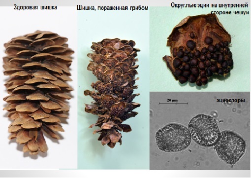 В одну из таких поездок О. А. Мочалова обнаружила на шишках ели сибирской фитопатогенный гриб Pucciniastrum areolatum. Для севера Дальнего Востока это новость. В 70-е годы прошлого столетия «еловый остров» обследовали дальневосточные микологи, но вид не был зафиксирован. Внимание привлекли пораженные шишки с растопыренными чешуйками, которые остаются на деревьях дольше здоровых. При созревании семян кроющие чешуи здоровых шишек раскрываются, но никогда не поворачиваются кверху, как у больной шишки.