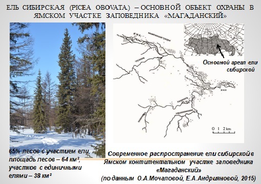 Ямский еловый остров — единственный в Магаданской области уголок темнохвойной тайги, сохранившийся до наших дней с давних времен, переживший оледенения, рубки, пожары и другие неблагоприятные воздействия. Этот реликтовый массив ели находится под защитой заповедания и охраняется государством. Он расположен более чем в 600 км от основного ареала ели сибирской (Picea obovata).