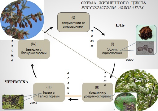 Перезимовавшие эциоспоры ветром переносятся на черемуху, где гриб проходит летнюю и осеннюю стадии развития. Поражение начинается, как только распускаются листья (в условиях Магаданской области — середина июня). На нижней стороне листа черемухи образуются резко ограниченные фиолетовые или красно-бурые пятна, на которых развиваются белые урединии. Урединиоспоры могут заражать новые листья черемухи. В конце лета — начале осени на верхней стороне листа черемухи между жилками образуются темно-бурые пятна, что свидетельствует о развитии телий внутри эпидермиса листа. Они зимуют на листьях черемухи и весной прорастают базидиями. Базидиоспоры разносятся ветром и, попадая на молодые шишки ели, заражают их. Таким образом, полный цикл развития гриб проходит в течение двух лет.