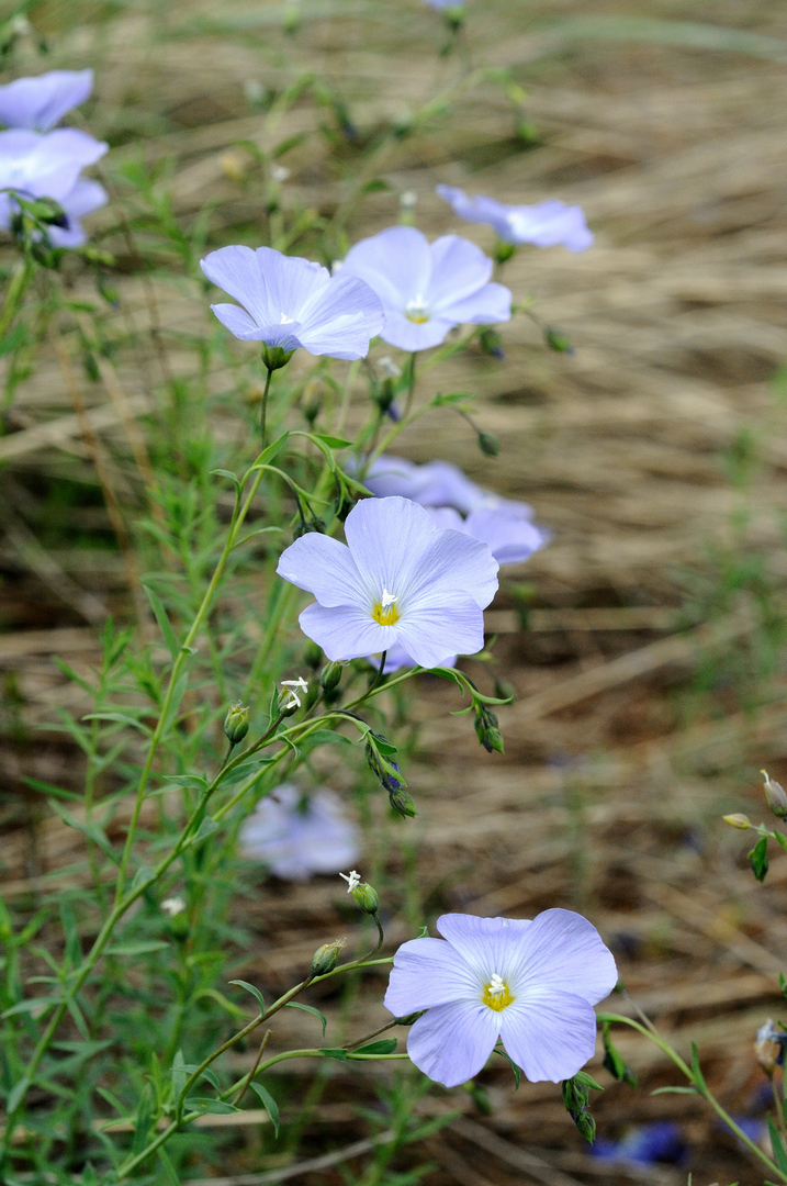 Описание. Растение высотой до 60 см с мощным деревянистым корнем и густо облиственными побегами. Листья узколинейные или линейно-ланцетные, острые, частично вниз отклоненные. Цветки в немногоцветковых соцветиях, ярко-голубые. Плоды – коробочки диаметром около 8 мм, яйцевидные, соломенно-желтые. Семена длиной около 4,5 мм коричневые, блестящие. Цветет в середине июня, плодоносит в начале августа.