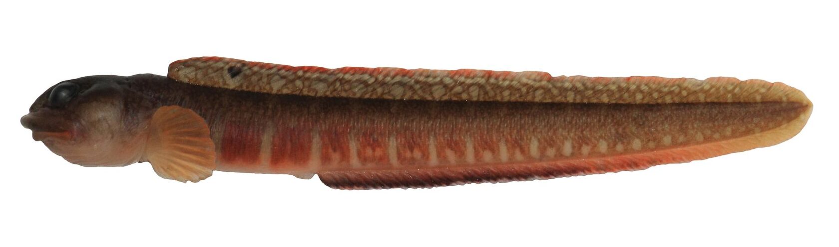 Мелкая рыба с угревидным телом, сильно сжатым с боков в хвостовой части, с длинными спинным и анальным плавниками. Общий фон головы и туловища буро-коричневый. Отличительная особенность окраски — узор на спинном плавнике из косых волнистых пятен и полосок, а также от 1 до 4 черных пятен со светлым ободком в передней части плавника.