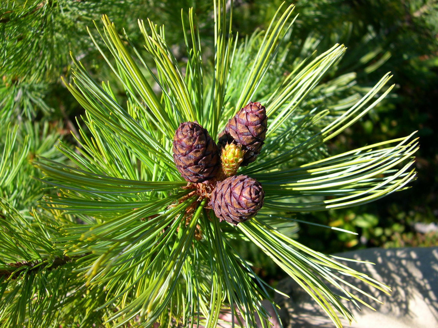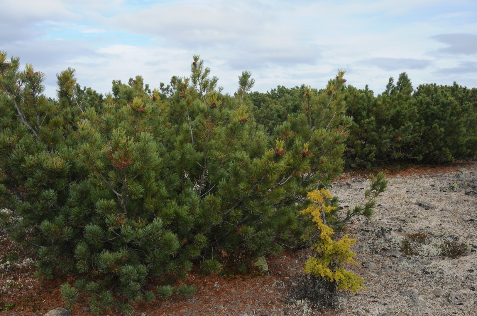 Описание. Небольшое стелющееся древесное растение с широко раскинутыми ветвями высотой 1−2 м (до 3−4 м). Толщина стволов до 15−18 см. На верхней границе распространения высота куста может не превышать 20−30 см. Относится к группе кедровых сосен, для которых характерны листья-иглы, собранные в пучки по 5 штук, и крупные съедобные семена в шишках. Длина листьев (игл) 5−6 см. Молодые шишки — небольшие мужские фиолетово-розового цвета длиной до 5−6 мм и в несколько раз крупнее коричневые женские — ежегодно появляются в июне. Мужские шишки рассеивают пыльцу и вскоре опадают, в женских шишках начинается формирование семян. Семена-орешки с деревянистой кожурой созревают на следующий год. Размер орешков 5−9 мм. Шишки овальной или яйцевидной формы длиной 5−6 см.