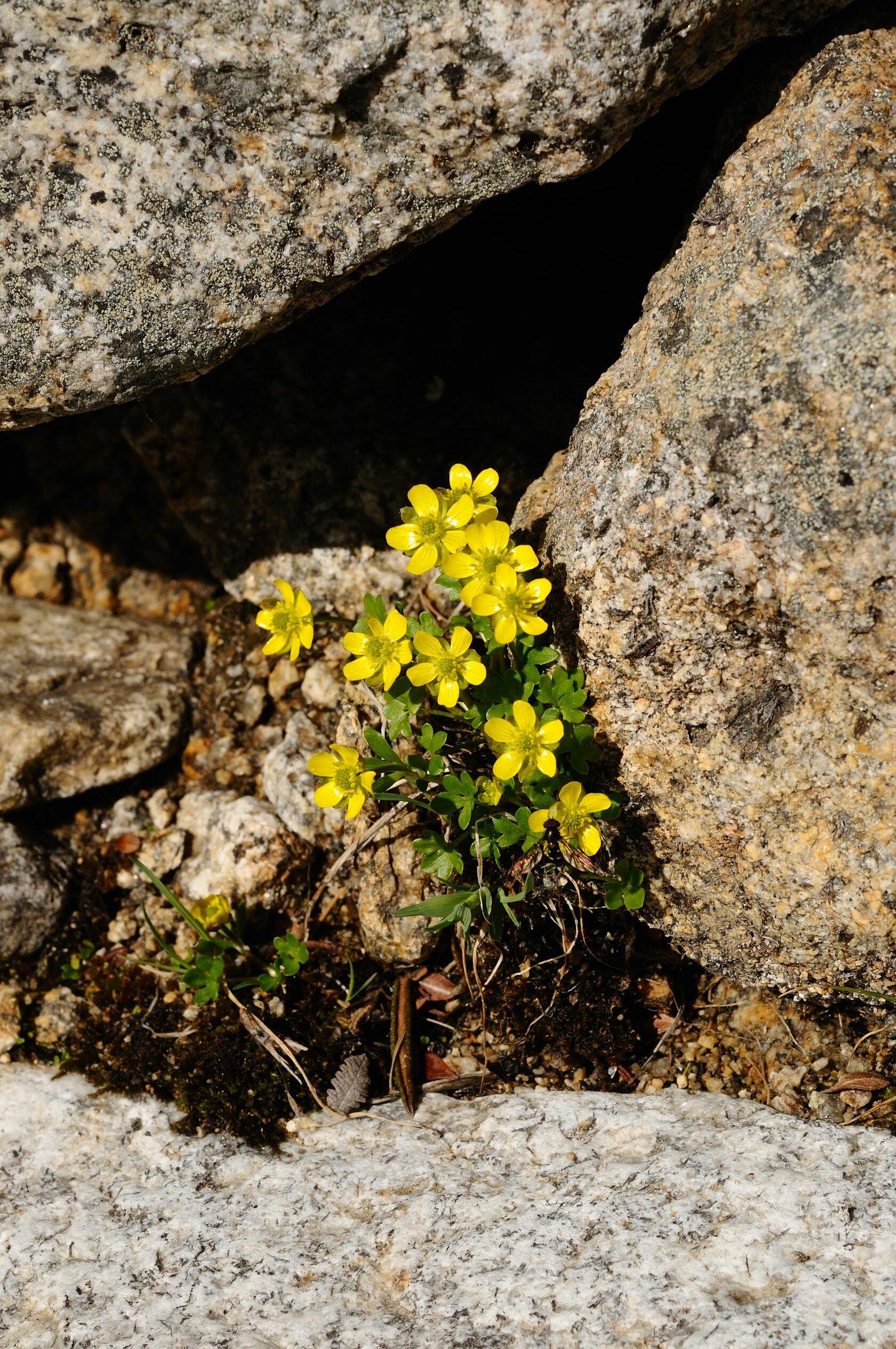Описание. Растение высотой до 5 (реже до 10) см с коротким вертикальным корневищем и пучком тонких нитевидных придаточных корней. Стебель изогнутый или прямой, простой. Прикорневые листья почковидные, глубоко рассеченные на 3−5 обратнояйцевидных цельнокрайных или городчато-зубчатых долей. Цветок одиночный диаметром 7−11 мм, ярко-желтый с блестящими лепестками. Цветет в середине июля, плодоносит в августе.