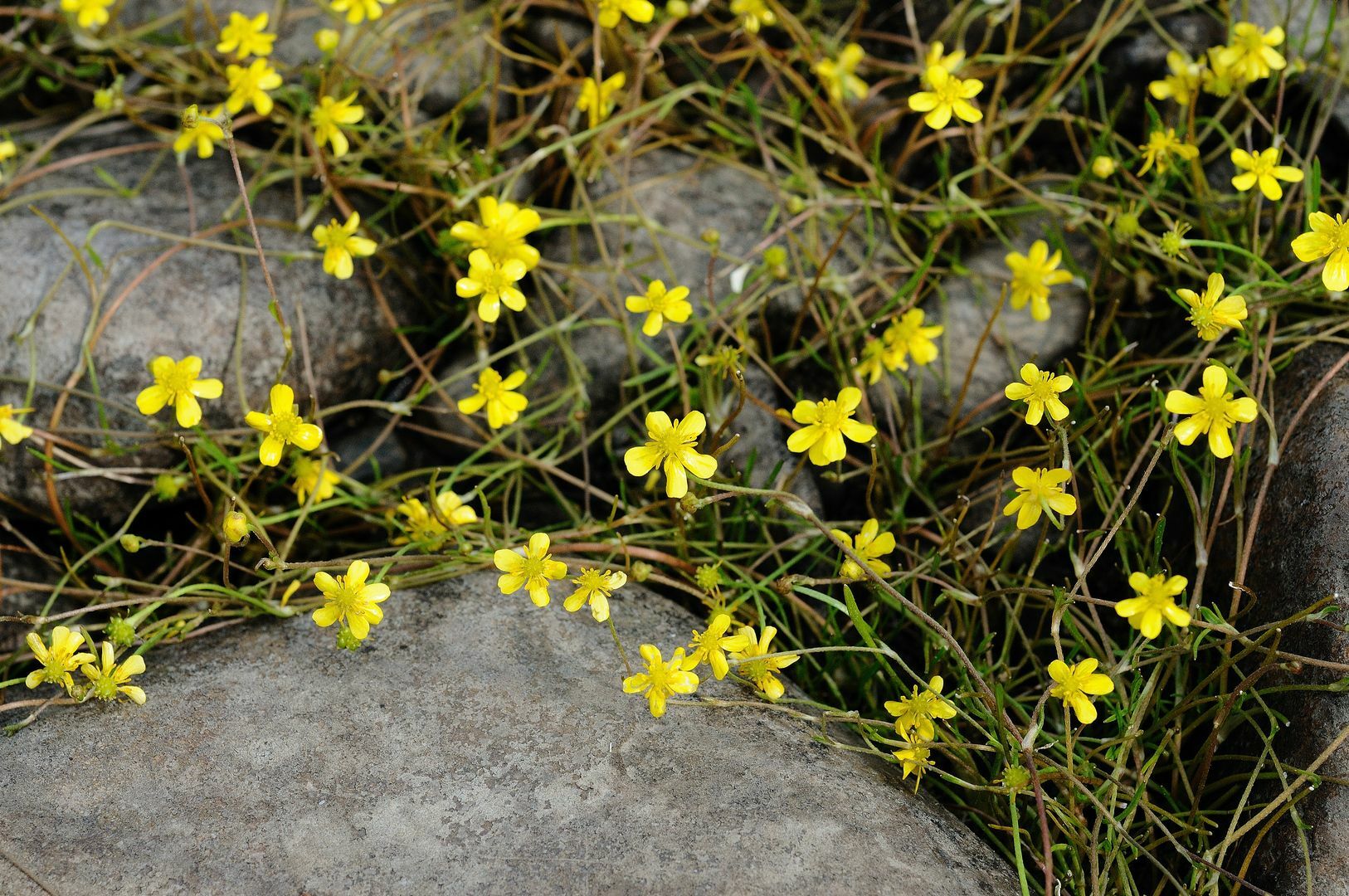 Описание. Растение высотой 20−25 см с тонкими стелющимися, укореняющимися в узлах ветвистыми стеблями. Листья длиной 2−5 см, линейные, слегка опушенные или голые. Цветки одиночные диаметром 5−9 мм, лепестки узкие ярко-желтые. Цветет в июле, плодоносит в августе.