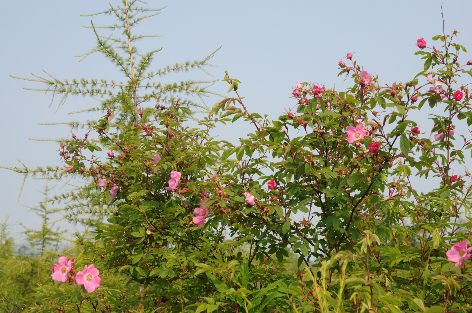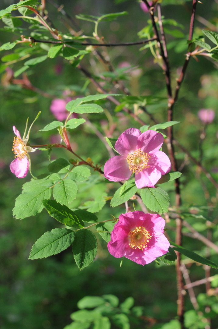 Описание. Куст высотой до 1,8 м с темно-бурыми или черно-пурпуровыми ветвями. В нижней части ветви иногда густо покрыты тонкими игольчатыми шипами. В верхней части ветвей, в отличие от шиповника иглистого, шипов мало, они крупные, расширенные у основания и расположены попарно у основания листьев. Листья с 5−7 листочками; листочки эллиптические с заостренной верхушкой, по краю пильчатые, снизу обычно опушенные мелкими волосками. Цветки розового цвета диаметром 4−6 см, одиночные или сгруппированы по 2−3 шт. Плоды шаровидные красного цвета диаметром 1−2 см.