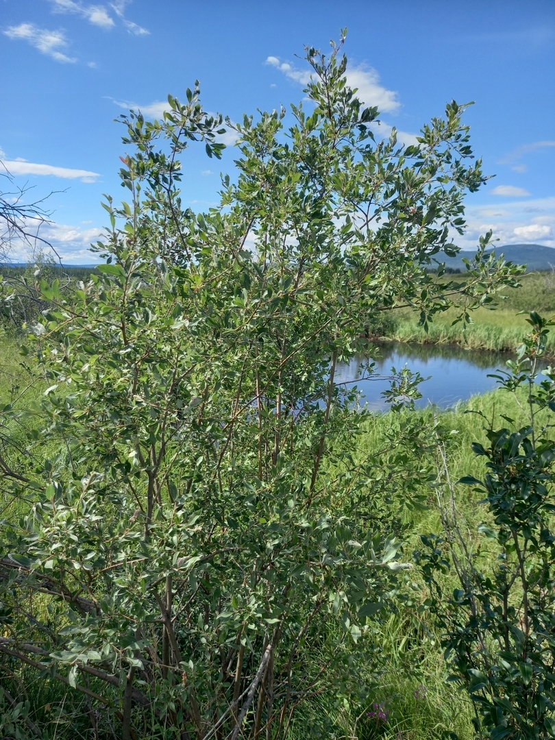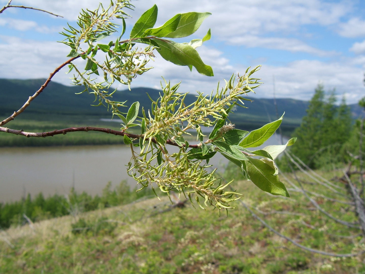 Описание. Кустарник, реже дерево, высотой 2−5 м. Ветви коричневые, довольно тонкие, растопыренные, от ствола приподнимающиеся, на концах свисающие. Могут быть слегка опушенными, но не всегда. Молодые побеги серо- или красно-бурые, войлочно-опушенные. Почки мелкие, волосистые. Прилистники полусердцевидные, быстро опадающие. Листья до 6,5 см длиной, жесткие, формой от яйцевидных до ланцетных, коротко заостренные со слегка завороченным краем, опушенные, на черешках длиной 4−8 мм.