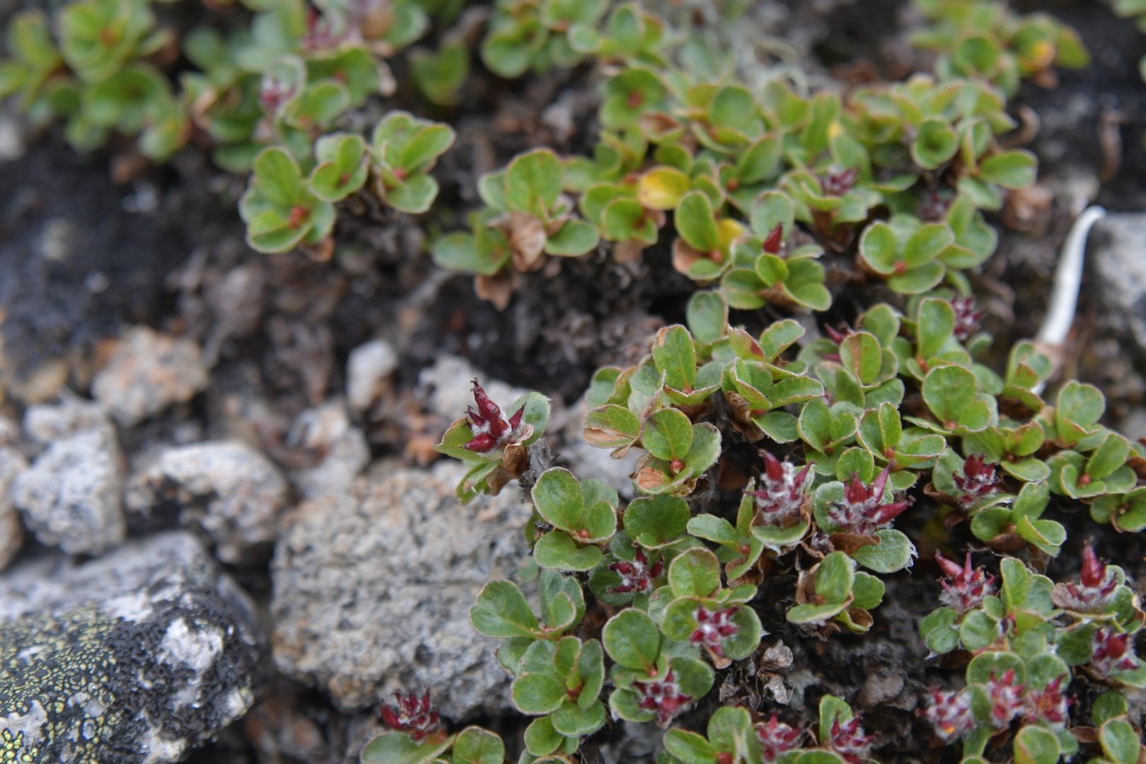 Описание. Крохотный кустарничек высотой до 3 см с подземными безлистными побегами. Надземные побеги коричнево-желтые, блестящие, голые или рассеянно-волосистые. Почки однотипные, цветочные почки длиной 1,5−3 мм, красновато-коричневые, острояйцевидные, голые. Черешки длиной 1−3 мм. Листовые пластинки длиной 0,3−1 см, шириной 0,3−0,6 см, обратнояйцевидные, широкоовальные или округлые, на верхушке закругленные, выемчатые или тупые, в основании широкие клиновидные или округленные, зубчатые, короткореснитчатые, зеленые, блестящие, голые. Мертвые листья прошлых лет длительно не опадают, при разрушении образуют сеточку жилок. Двудомное: мужские и женские сережки на разных растениях. Генеративные побеги короткие, олиственные; женские сережки длиной около 1 см, почти шаровидные, малоцветковые. Плоды длиной 3,5−4,5 мм вишнево-коричневые, голые или на верхушке слабоопушенные. Семена с пучком тонких белых волосков.