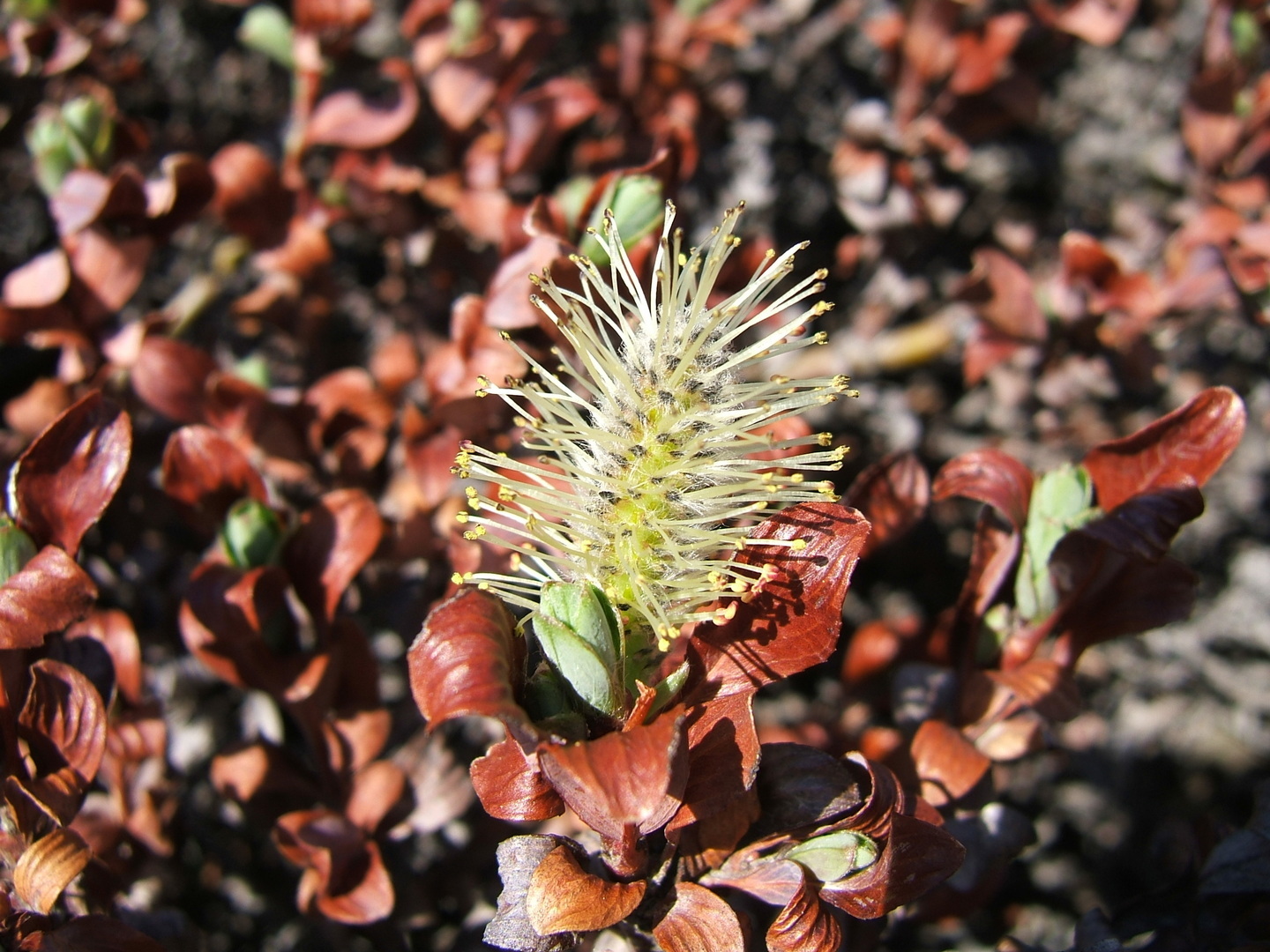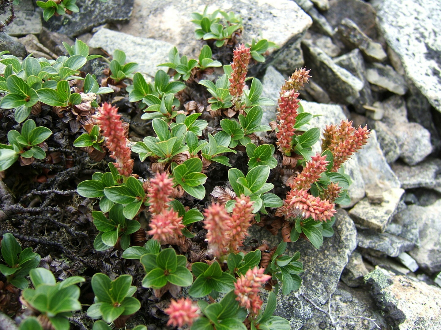 Описание. Распростертый или подушковидный кустарник высотой 0,2−0,3 м, образующий плотную «подушку». Старые ветви толщиной до 1 см, укореняются. Побеги короткие, каштаново- или красно-бурые, блестящие, голые. Почки диморфные, т. е. генеративные почки отличаются от вегетативных. Цветочные почки длиной 3−4 мм, яйцевидно-ланцетовидные, блестящие. Прилистники длиной 2−3 мм. Черешки длиной 2−8 мм, голые. Листовые пластинки длиной 1,5−3 см, шириной 0,5−1,5 см эллиптически-ромбические или обратнояйцевидные, в основании клиновидные, мелко-острозубчатые, кожистые, голые, сверху зеленые и блестящие, снизу бледно-зеленые. Отмершие листовые пластинки несколько лет сохраняются на ветвях, они коричневые или фиолетово-коричневые. Генеративные побеги до 1 см длиной, без развитых листьев, сережки длиной 2−3 см. Двудомное: мужские и женские сережки на разных растениях. Мужские светло-желтые, женские сережки при плодах зеленовато-кирпичного цвета или зеленые, коробочки покрыты очень коротким прижатым пушком. Зрелые семена с пучком тонких белых волосков, созревают в июле. Во второй половине лета все растение начинает издавать сладкий медовый аромат, по которому его легко отличить от других видов ив.
