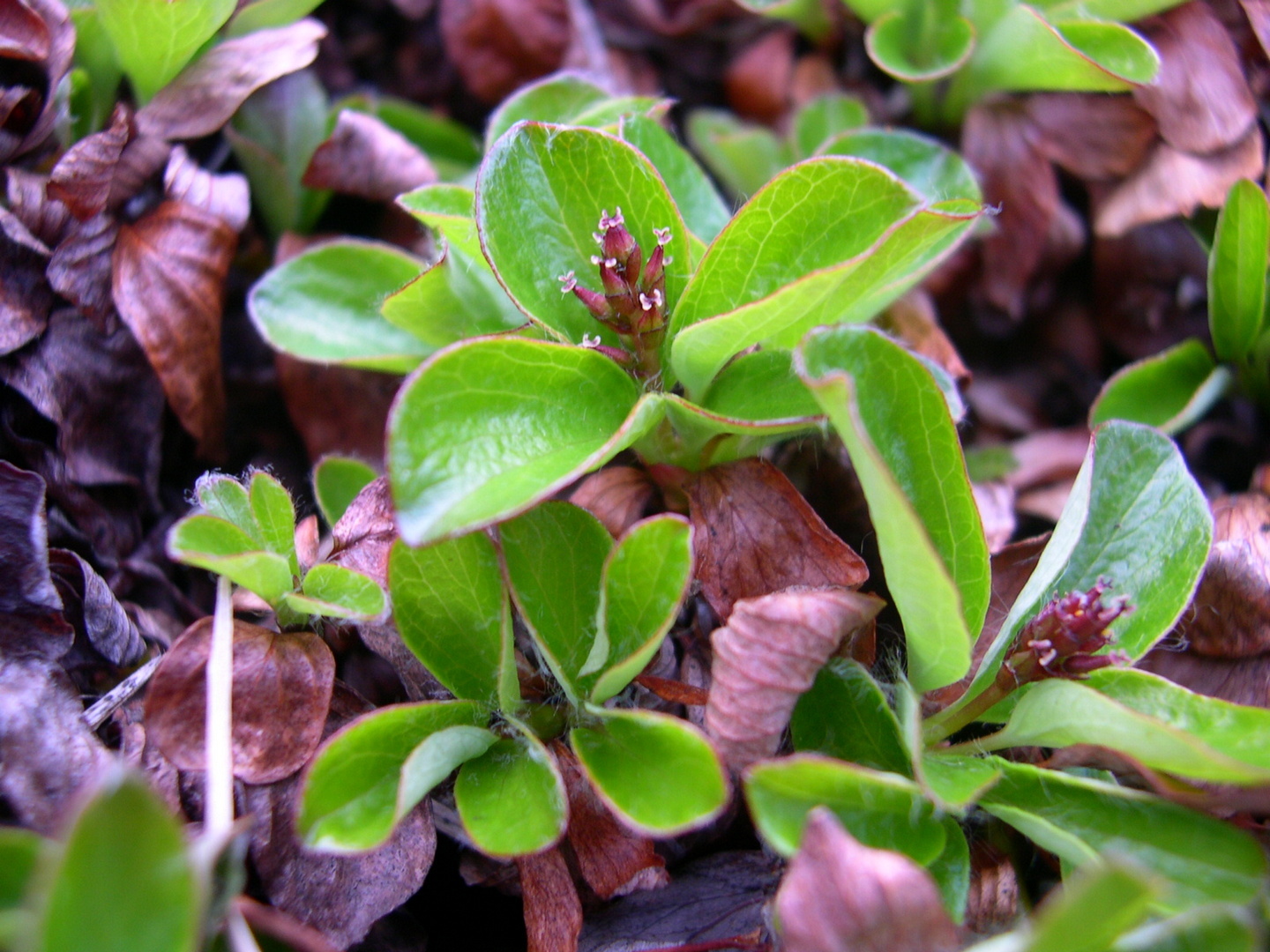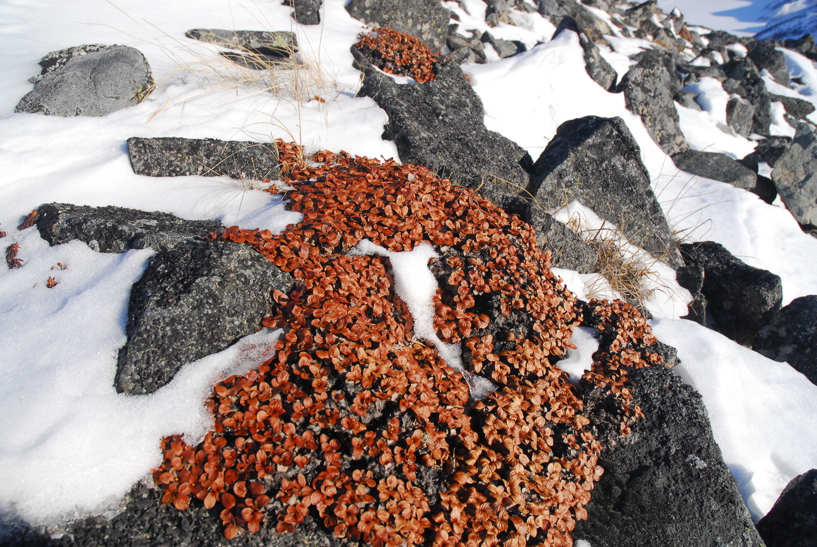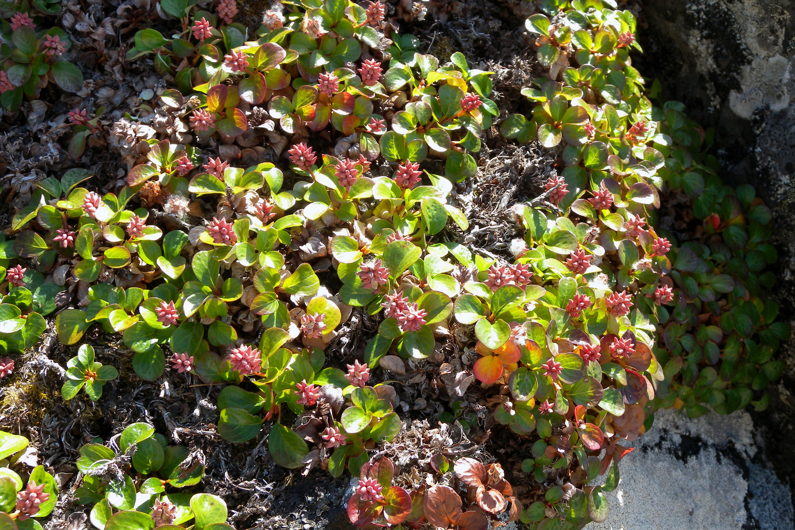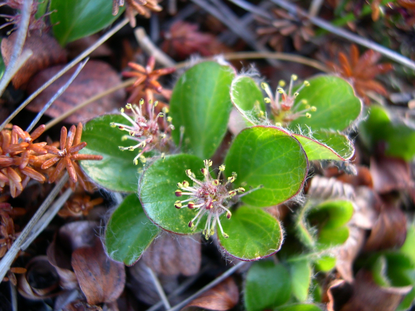 Описание. Маленький подушковидный кустарник. Старые ветви не укореняющиеся, коричневые, короткие, голые, отходят от мощного каудекса (образование на границе стеблевой и корневой частей растения). Побеги толщиной 1,2−2 мм, цветом от охристо-желтых до темно-каштановых, блестящие, голые. Почки мономорфные, т. е. цветочные почки не сильно отличаются от вегетативных. Цветочные почки длиной до 3 мм, желтые, овально-обратнояйцевидные или обратнояйцевидные, голые. Прилистники мельчайшие. Черешки длиной 7−15 мм, голые. Листовые пластинки длиной 0,8−1,3 (до 2) см, шириной 0,7−1,1 (до 1,7) см, округлые или округло-яйцевидные, на верхушке закругленные, в основании округленные или слабо сердцевидные, цельнокрайные, подвернутые, плотные, голые, сверху светло-зеленые, блестящие, снизу зеленые, матовые. Листовые пластинки прошлых лет долго сохраняются на ветвях, темно-коричневые, блестящие. Двудомное: мужские и женские сережки на разных растениях. Цветущие сережки малозаметные, т. к. короткие — из 7−20 цветков, окрашены неярко. Женские сережки при созревании становятся красновато-бурыми. Зрелые семена с пучком тонких белых волосков. Семена созревают в августе.