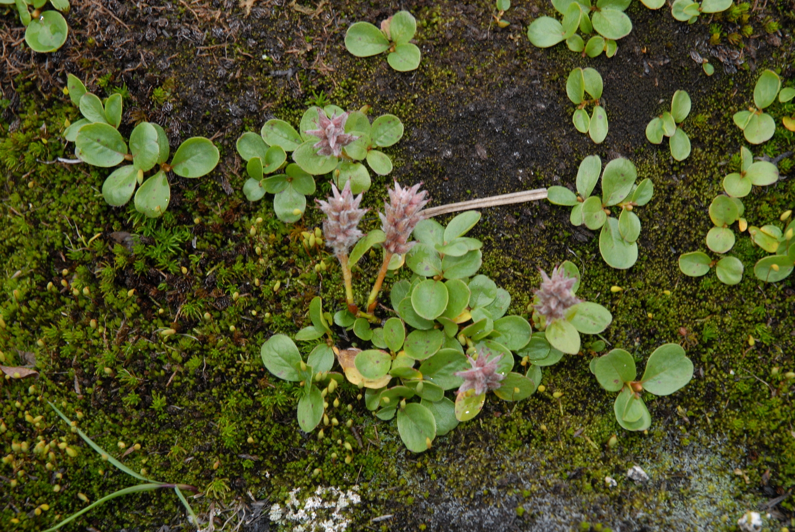Описание. Карликовый стелющийся кустарничек, возвышающийся над землей не более чем на 3−5 см. Часть побегов скрывается под землей или в моховой подушке. Надземные побеги зеленовато-коричневые, голые, с 2−5 листьями. Цветочные почки эллиптически-обратнояйцевидные, тупые, с сизым налетом, голые. Листья осенью опадают, не сохраняются на ветвях. Черешки длиной 2−10 мм, коричневые, голые. Листовые пластинки длиной 1−2 (до 4) см, шириной 0,5−1,2 (до 2) см, округло-обратнояйцевидные, на верхушке закругленные, выемчатые или тупые, в основании клиновидные или округленные, большей частью неравнобокие, цельнокрайные, зеленые, блестящие, сверху голые или по краю реснитчатые, снизу голые, реже рассеянно-шелковистые. Генеративные побеги, несущие сережки длиной 0,5−1,5 (до 2) см, олиственные; сережки длиной 1,5−2 (до 3,5) см, коробочки голые или слабоволосистые. Двудомное: мужские и женские сережки на разных растениях. Зрелые семена с пучком тонких белых волосков. Семена созревают в августе.