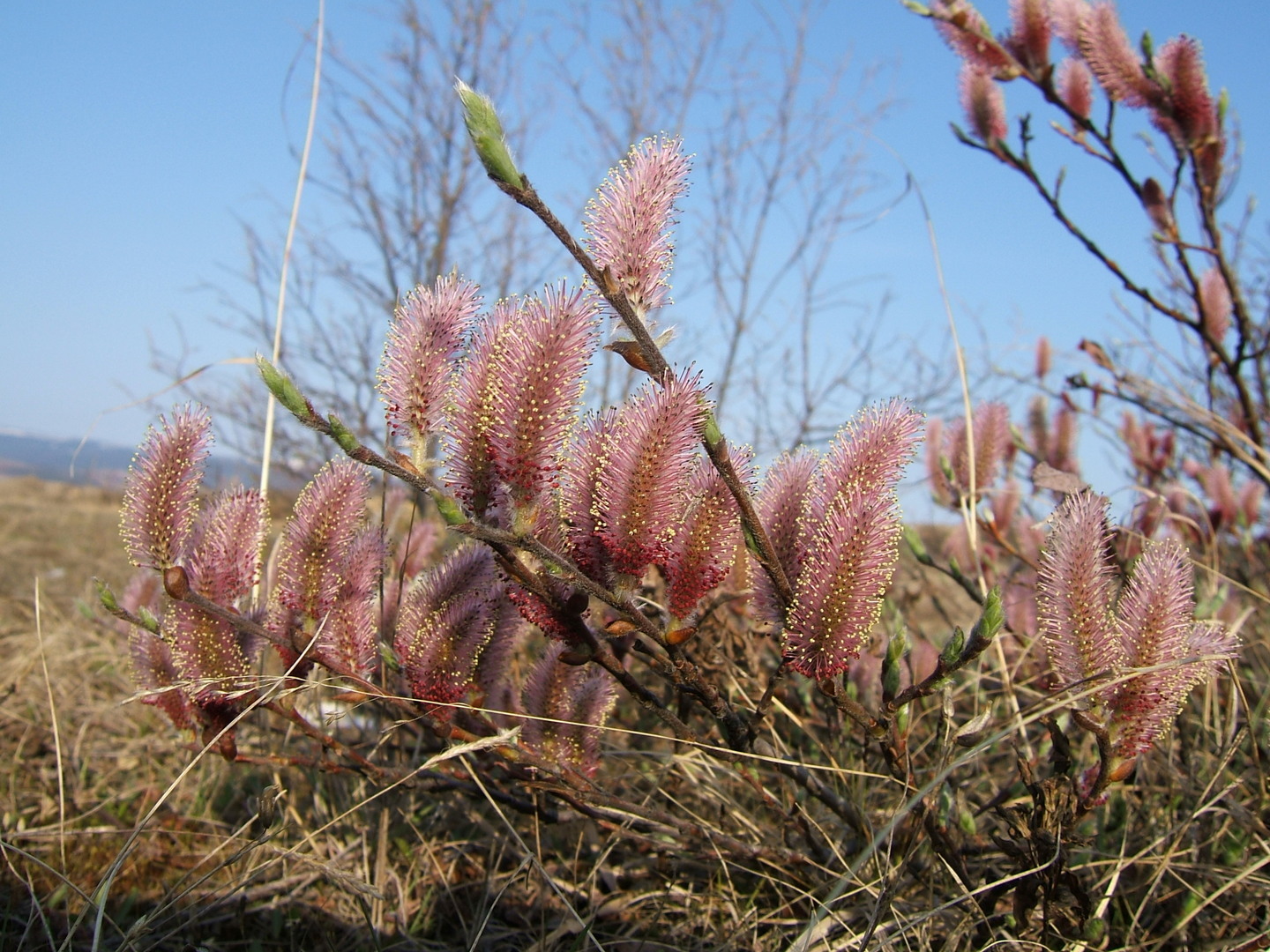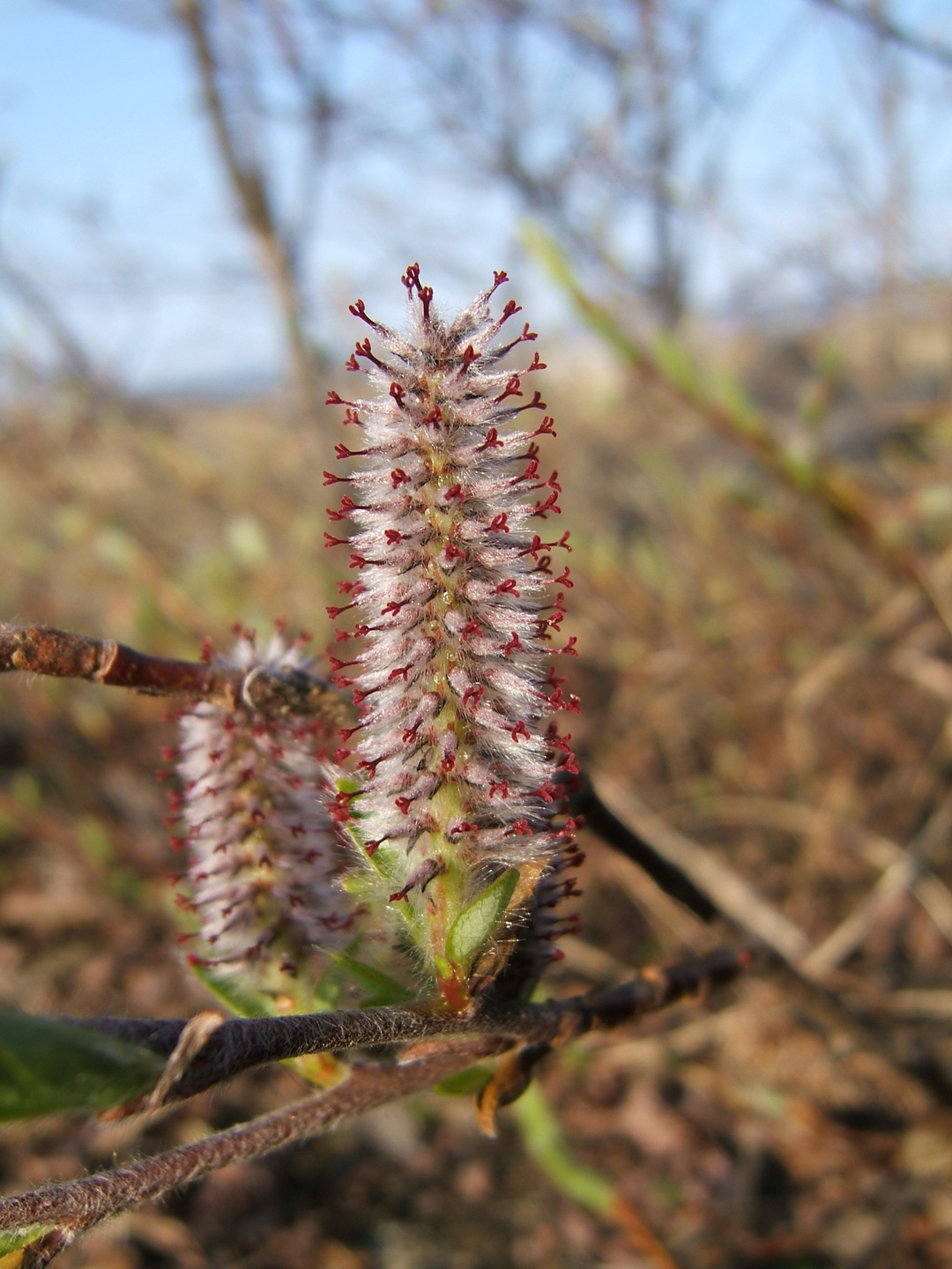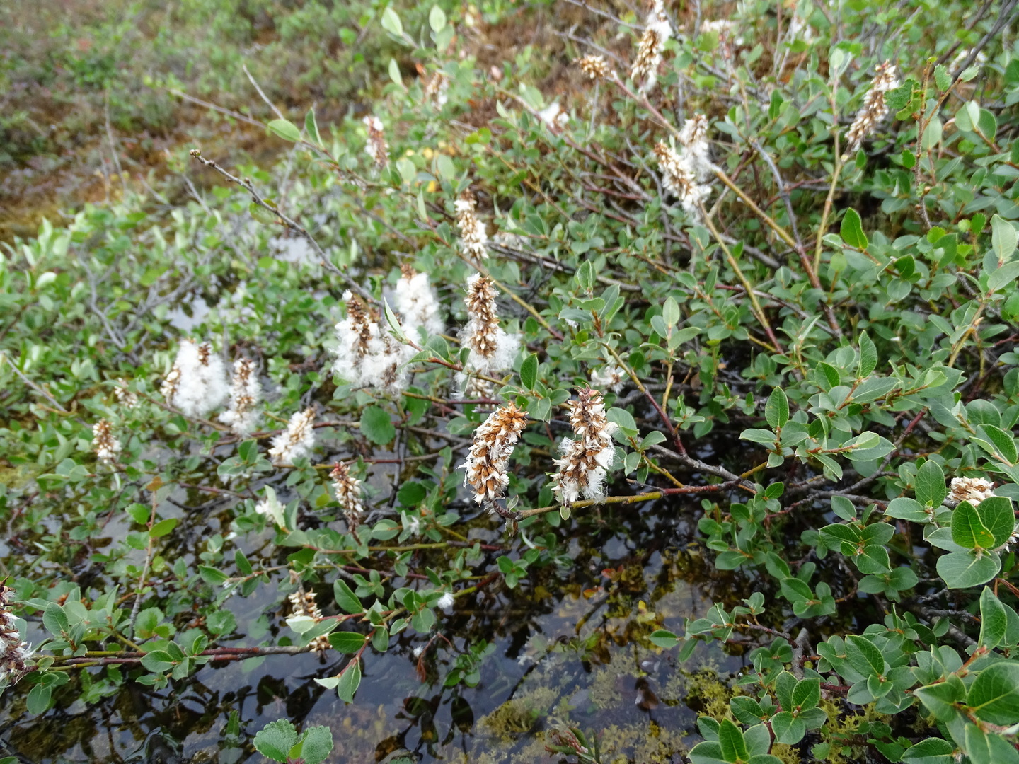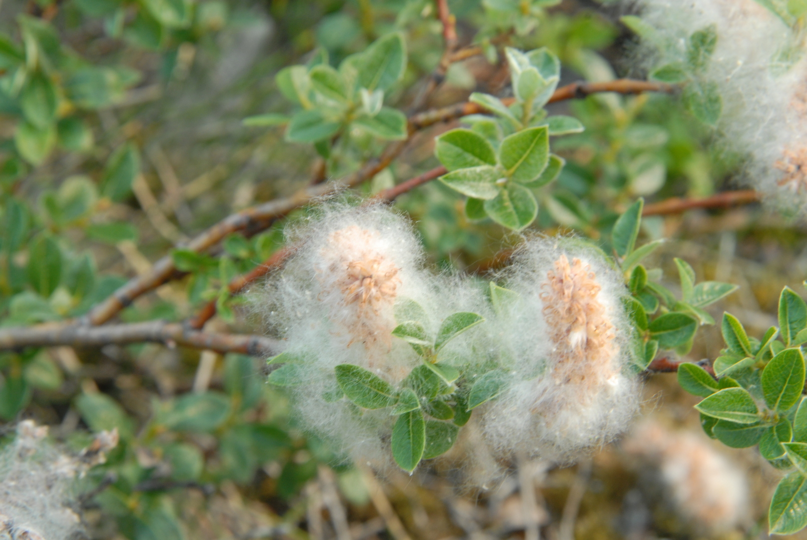 Описание. Куст высотой до 50−70 см, иногда распластанный, в зависимости от условий произрастания. Ветви параллельны земле или вверх торчащие, желтые или серо-бурые блестящие, обычно голые. Молодые побеги тонкие желто-бурые, могут быть и голые и густо опушенные. Цветочные почки до 5 мм длиной, слабо отличаются от генеративных. Прилистники мелкие, быстро опадающие. Листья длиной 1−3 см, широкоэллиптические, заостренные, цельнокрайные, молодые шелковисто опушенные, взрослые совершенно голые на красных черешках длиной 2−5 мм. Сережки на побеге длиной до 2 см с 3−4 мелкими листьями. Мужские сережки длиной до 6 см пурпурного цвета. Женские сережки в плодах могут достигать длины 6−8 см. Зрелые семена с пучком тонких белых волосков.