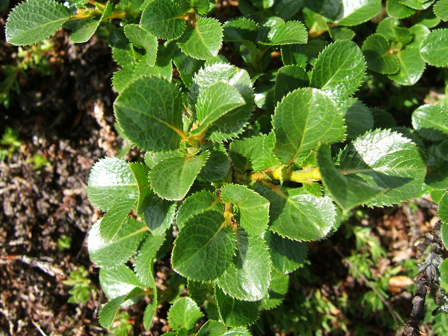 Описание. Куст до 0,5 м высотой. Ветви приподнимающиеся, восходящие или простертые, голые. Побеги диаметром около 1,5 мм, коричневые, от более-менее волосистых до голых. Цветочные почки длиной 3−5,5 мм, широкояйцевидные, коричневые, голые. Прилистники длиной до 5−7 мм, ланцетные, железисто-зубчатые, голые. Черешки длиной до 3,5 мм. Листовые пластинки длиной 1−2,2 см, шириной 0,6−1,6 см, от широких овальных до почти округлых, на верхушке закругленные, в основании округленные или несколько сердцевидные, остро-шиповато-зубчатые (зубцы длиной до 0,5−1,5 мм, по 12−25 с каждой стороны), кожистые, очень редко снизу опушенные, голые, зеленые, блестящие. Отмершие листовые пластинки сохраняются на ветвях несколько лет, листья прошлых лет коричневые, блестящие, разрушаются без скелетизации (образования сеточки из жилок). Двудомное: мужские и женские сережки на разных растениях. Генеративные побеги с волосистой осью и 2−3 уменьшенными листьями, сережки появляются раньше листьев. Женские сережки при плодах длиной до 3 см; плоды — коробочки, голые или частично опушенные спутанными волосками. Семена с пучком тонких белых волосков.