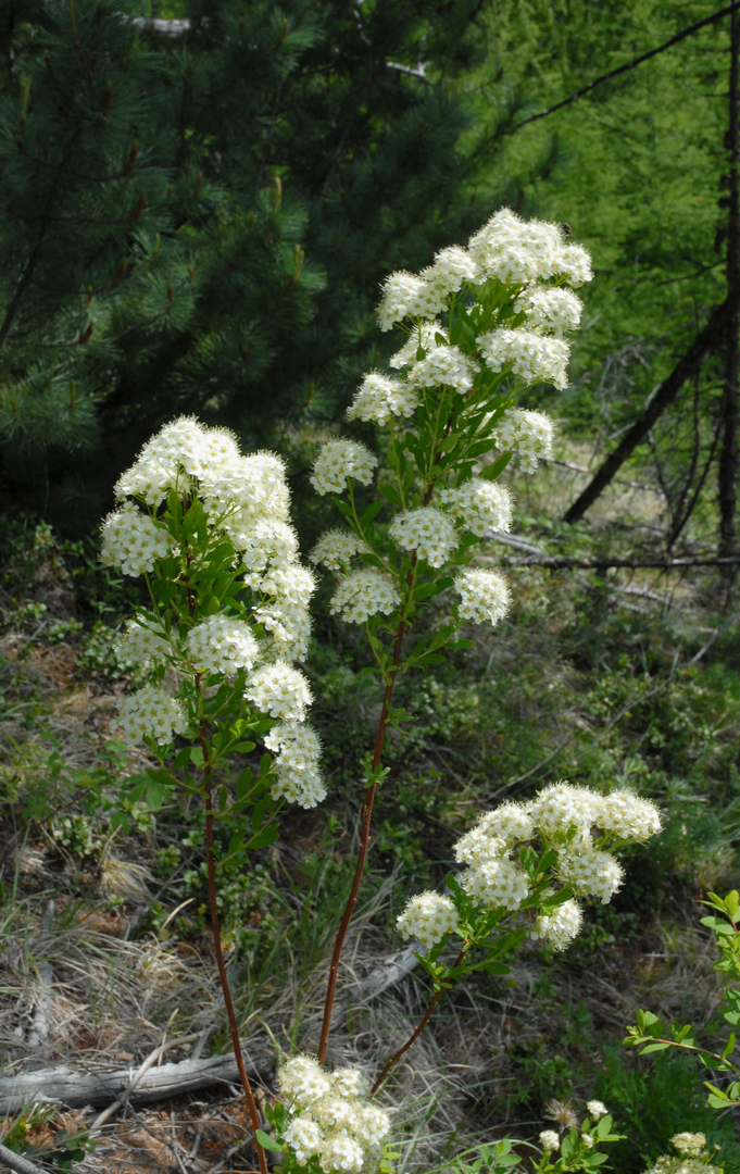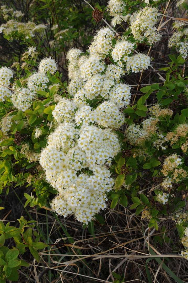 Описание. Куст высотой 0,5−1,5 м с тонкими неребристыми голыми или опушенными побегами, покрытыми коричневой отслаивающейся корой. Листья длиной 1−4 см, шириной 2−4 см эллиптические, продолговатые до почти ланцетных, на генеративных побегах цельнокрайные, на вегетативных — обычно на верхушке с немногими неравными зубцами, с обеих сторон голые или прижато-опушенные. Генеративные побеги длиной 3−8 см. Цветки белые диаметром 7−9 мм, собраны в щитковидные соцветия; тычинки длиннее лепестков. Листовки голые или волосистые.